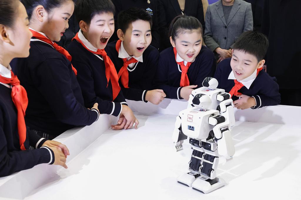 11月28日,孩子们在展览上观看机器人。