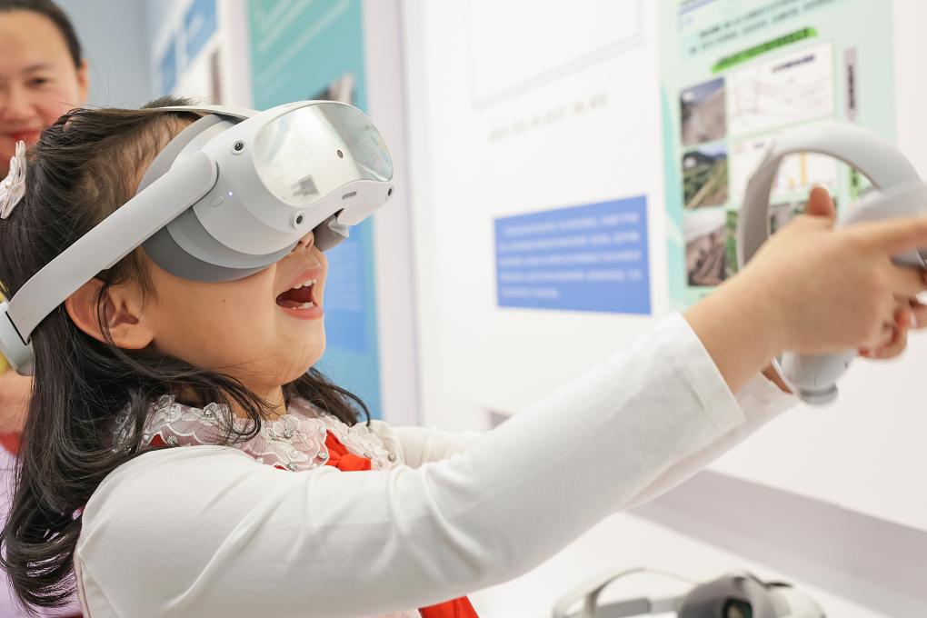 11月28日,一名小朋友在展览上体验VR装置。