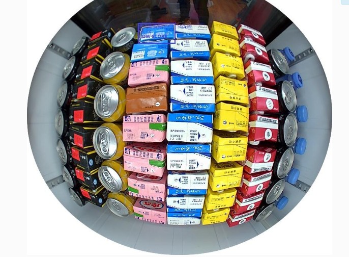 商品的识别大部分是在特定的场景下进行,具体的物理摆放会大大增加识别的难度。下图是一个智能零售柜内用鱼眼摄像头拍到的图片,我们可以看到大部分商品只漏顶部的一些信息,有些只漏出瓶盖的部分,这样对类似商品的区分大大增加了难度。