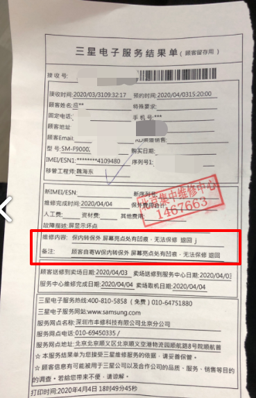 ▲售后人员以“屏幕亮点处有凹痕”为由拒绝保修