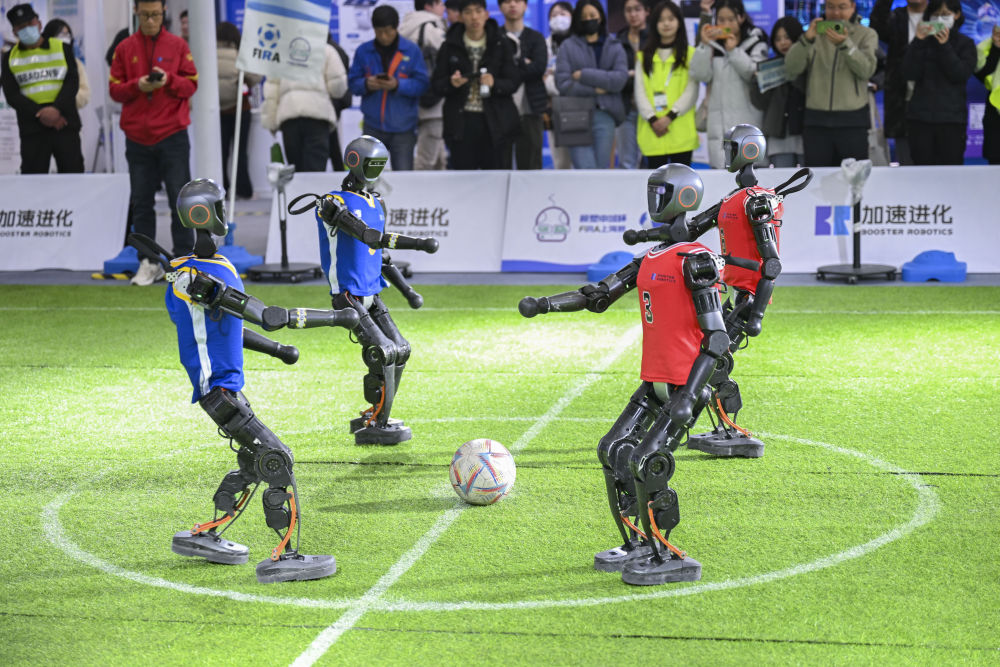 机器人踢足球。新华社记者陈浩明摄