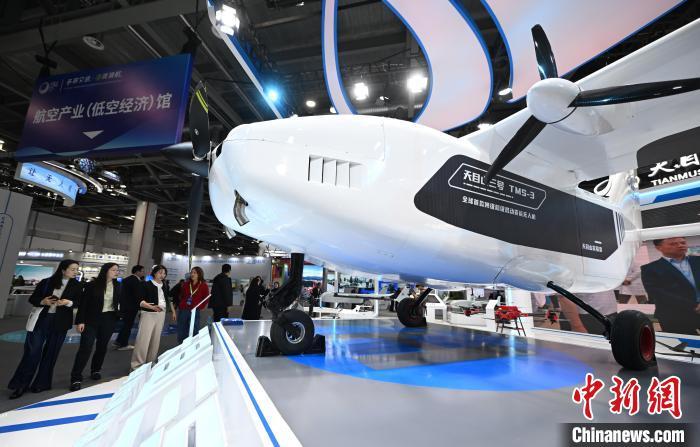 12月5日,天目山实验室的全球首款吨级超级混动货运无人机吸引参观者,该无人机有效载荷630公斤,最大航程1800公里。中新社记者 王刚 摄