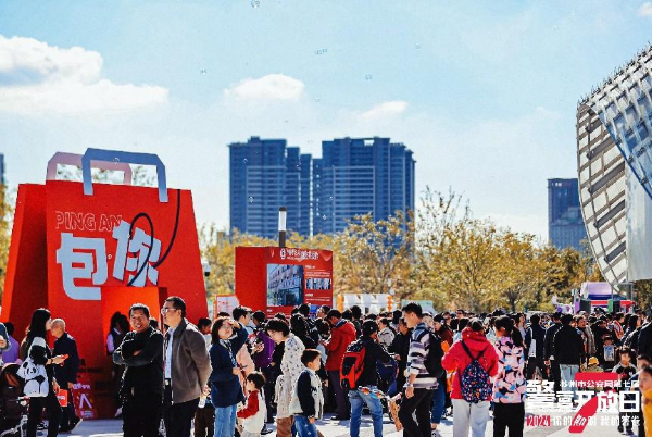 在活动的各个区域,丰富多样的展示与互动项目令人目不暇接。最引人注目的当属“包你平安”展位,这里吸引了大量市民驻足围观。展位前人声鼎沸,人气爆棚,市民通过微博、小红书分享集赞的方式可以领取宽达80厘米,大如桌面的橙色“包你平安”手提袋;通过参加“金融安全知识”答题,可获得一个“包你平安”包挂,这两样人气文创产品背在身上尤其显眼,被领到的市民和小朋友们戏称为“显眼包”,成为当日活动现场一道独特的风景线。