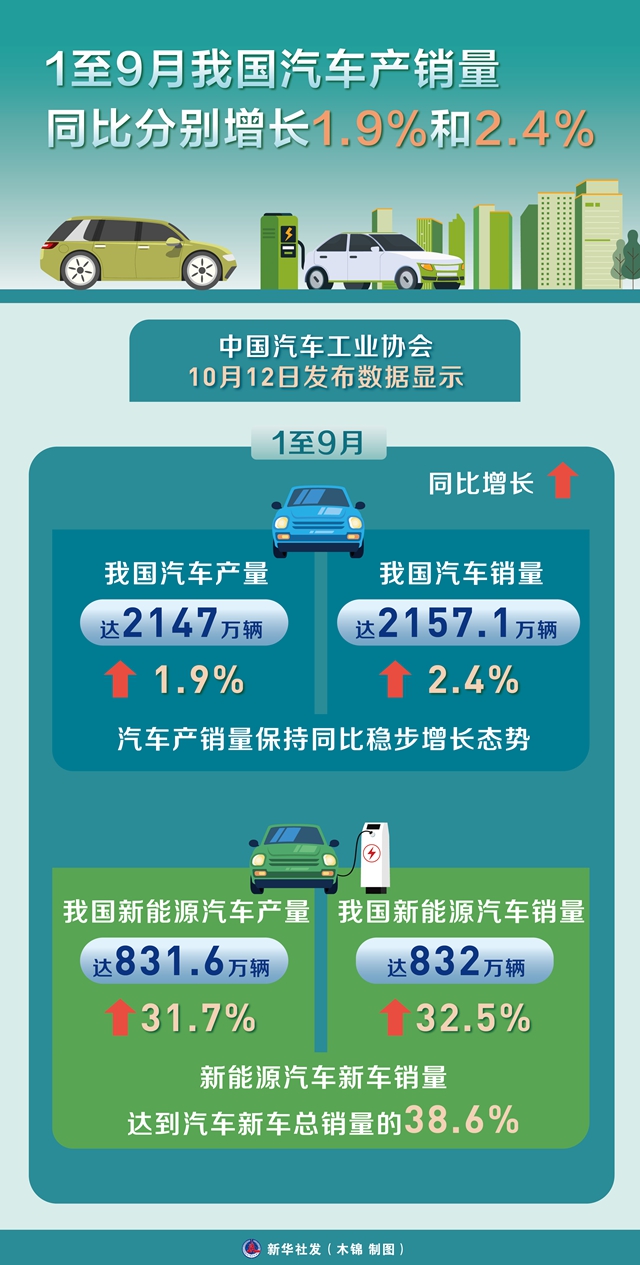 中国汽车工业协会12日发布数据显示,1至9月,我国汽车产销量达2147万辆和2157.1万辆,同比分别增长1.9%和2.4%,汽车产销量保持同比稳步增长态势。