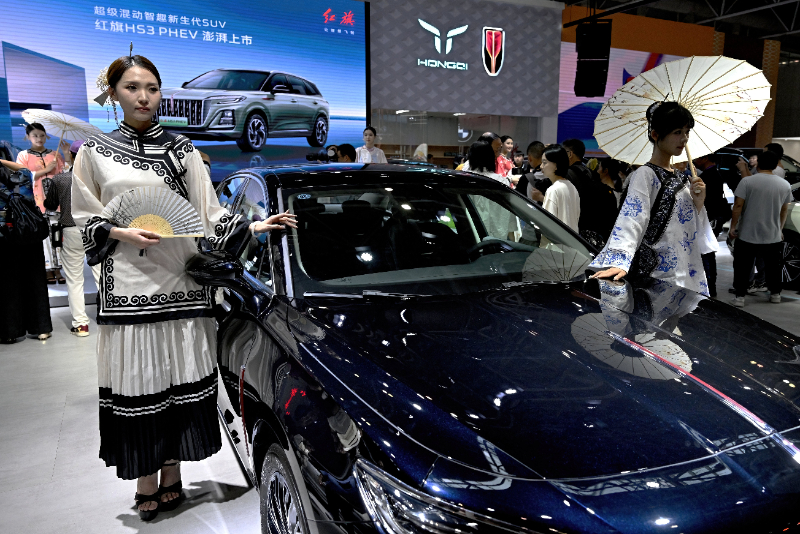 10月1日,在第44届中国(福州)国际汽车博览会暨第3届中国(福州)国际智能网联汽车体验博览会上,模特展示一款红旗新车型。