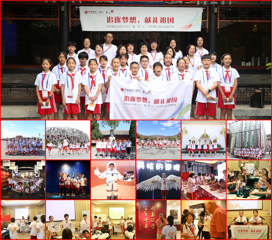 壮丽70年,奋斗新时代。中信银行信用卡中心2019第十届“爱·信·汇”公益夏令营以首都北京为大本营,期冀孩子们的小小梦想融汇到复兴富强的“中国梦”里,追逐梦想、以行践梦,奋发向上、献礼祖国。中信银行信用卡中心“爱·信·汇”项目负责人介绍说,为期8天的夏令营,一方面继续以“梦想课程”为核心,教授思维导图、罗伯特规则、ORID焦点讨论法、理财、拍卖等内容,安排采访、播报、辩论、小小书制作等环节,培养孩子们独立思考、分析探究和动手能力;另一方面,带领孩子学习“开笔礼”、礼拜天安门、赏京剧、走进博物馆天文馆、体验宋庆龄创空间智能科技、来到鸟巢水立方、行走世园会、寻访古北水镇……让孩子们切身感受祖国在文化、科技、艺术等各方面的强盛,增强自豪感、激发爱国追梦的斗志。
