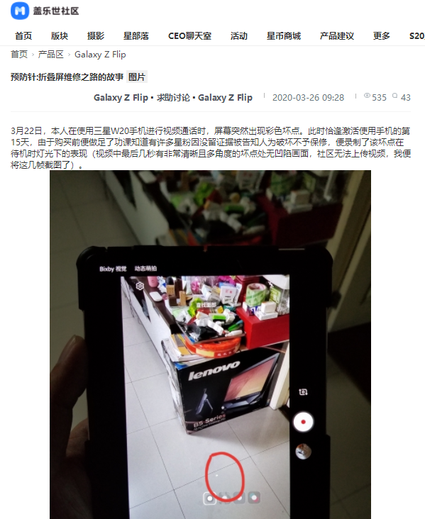 ▲有用户在三星官方论坛发帖表示折叠手机屏幕出现斑点