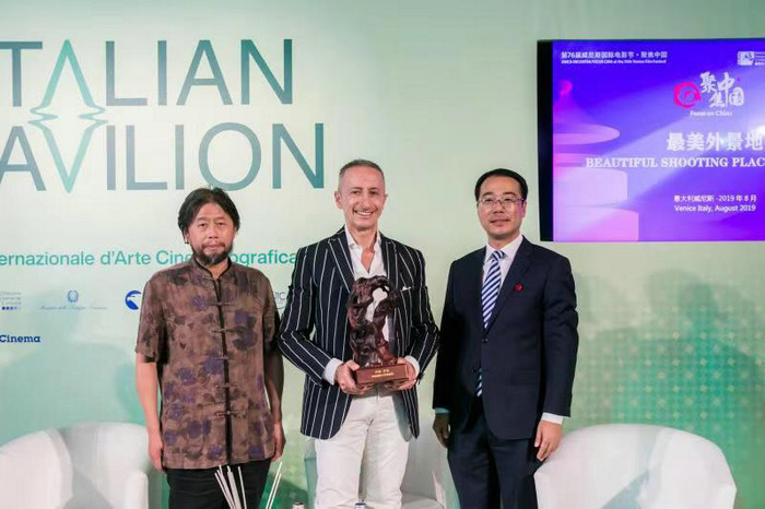 8月29日,在第76届威尼斯电影节“聚焦中国”主题活动“最美外景地”环节,中国浙江开化县长鲁霞光(右)和来自开化的根雕大师徐谷青(左)向意大利国家电影音像和多媒体工业协会国际部主任罗伯托·斯塔比莱先生展示徐谷青制作的开化根雕作品。(新华网发,聚焦中国活动供图)