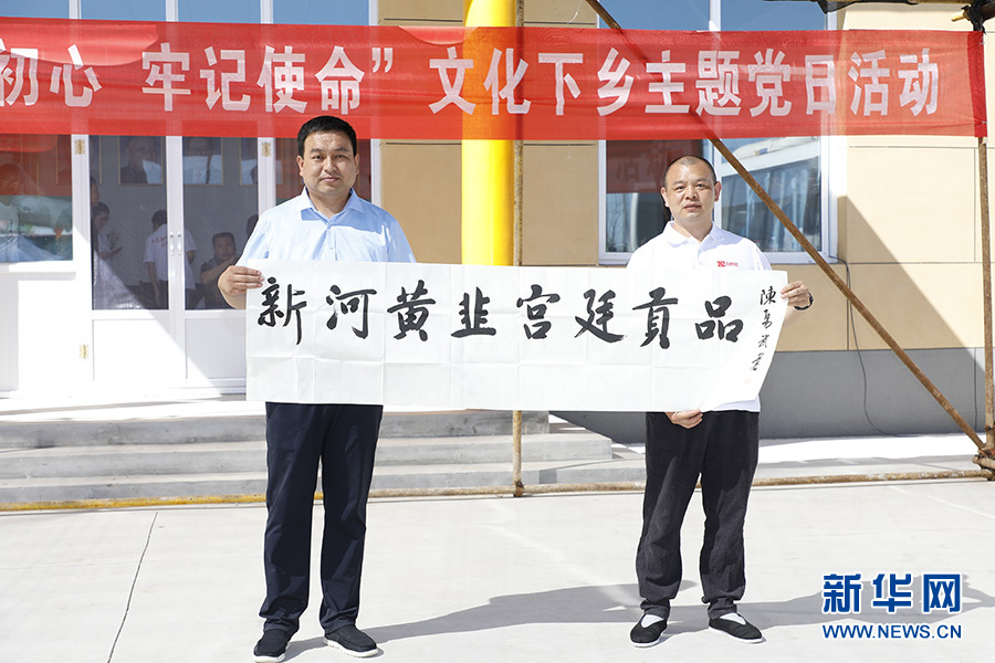 陈勇武(右)为当地特色农产品题字。毛鹤然摄